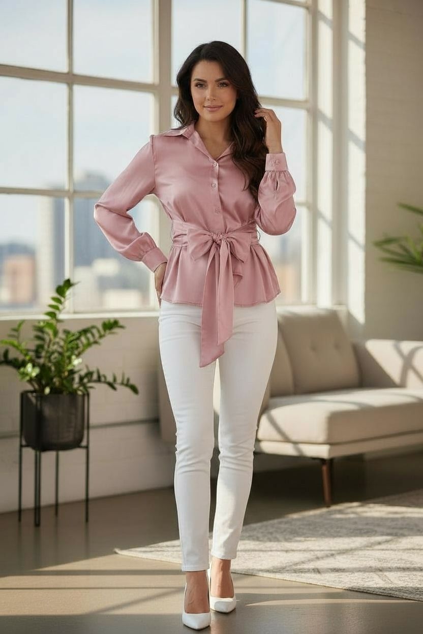 This sophisticated satin blouse showcases a delicate light pink hue with a graceful front tie closure that defines the waistline...