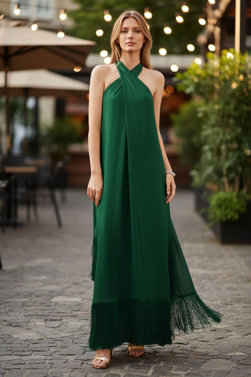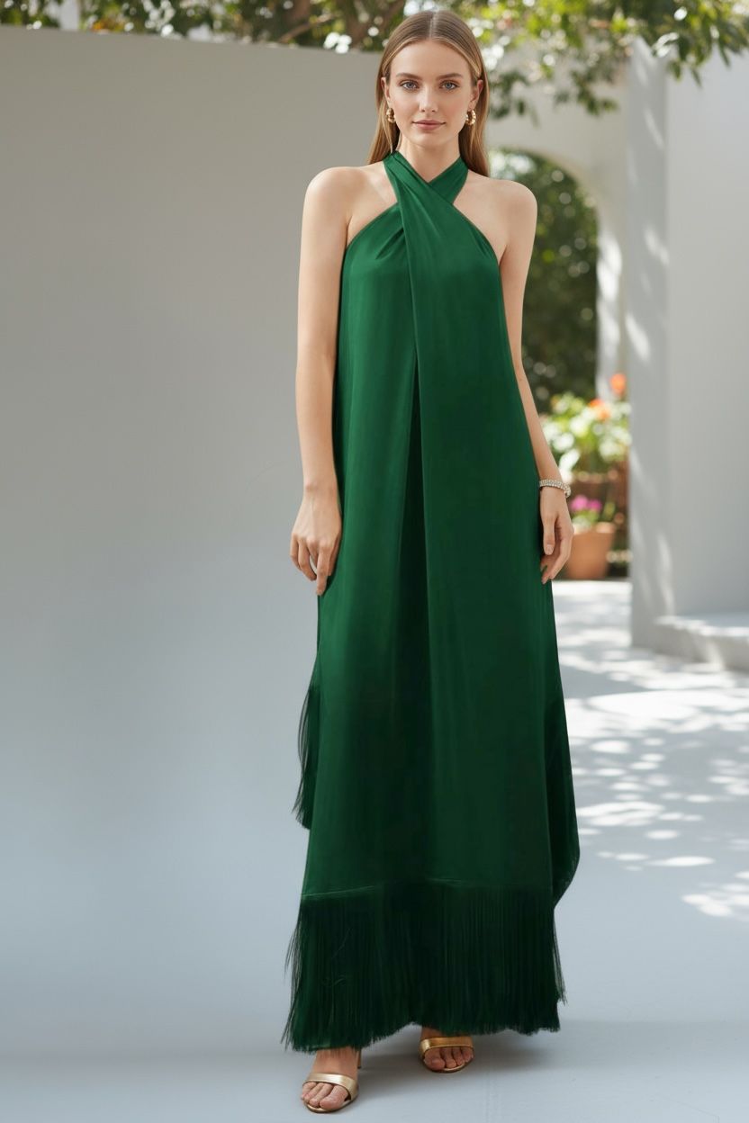 Crisscross halter top dress with solid fringe hem
