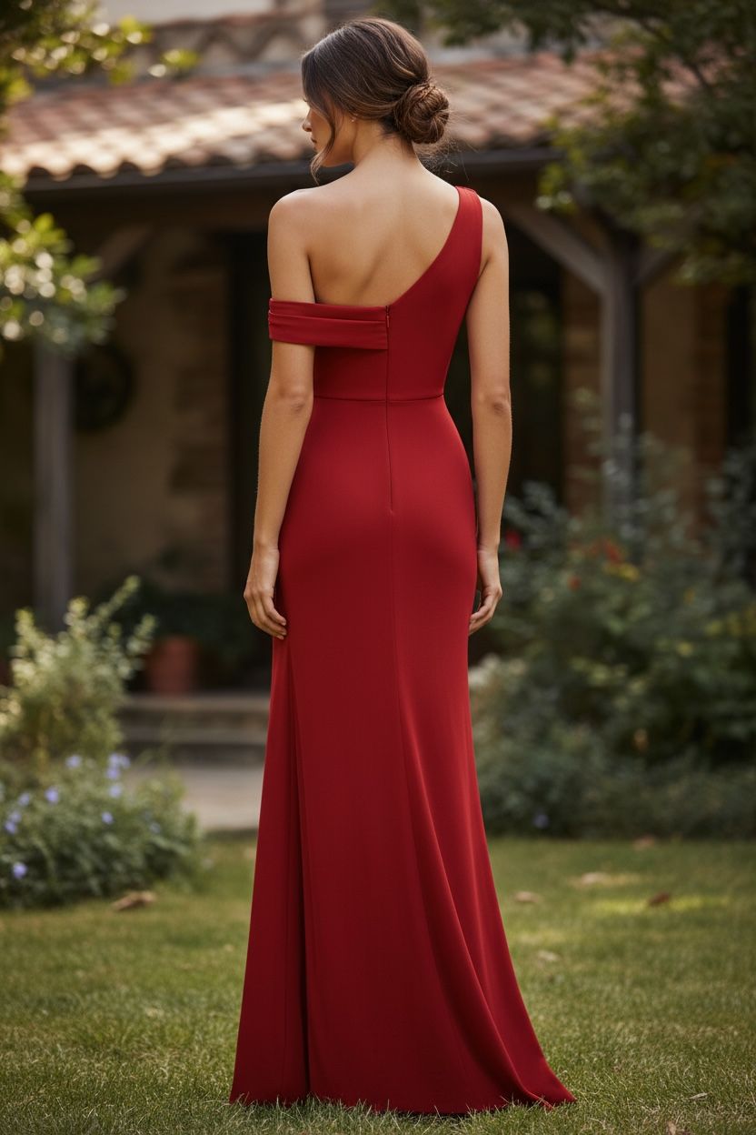 This sophisticated dress features an elegant oblique shoulder design with a distinctive twist knot detail, elevated by a gleaming gold...
