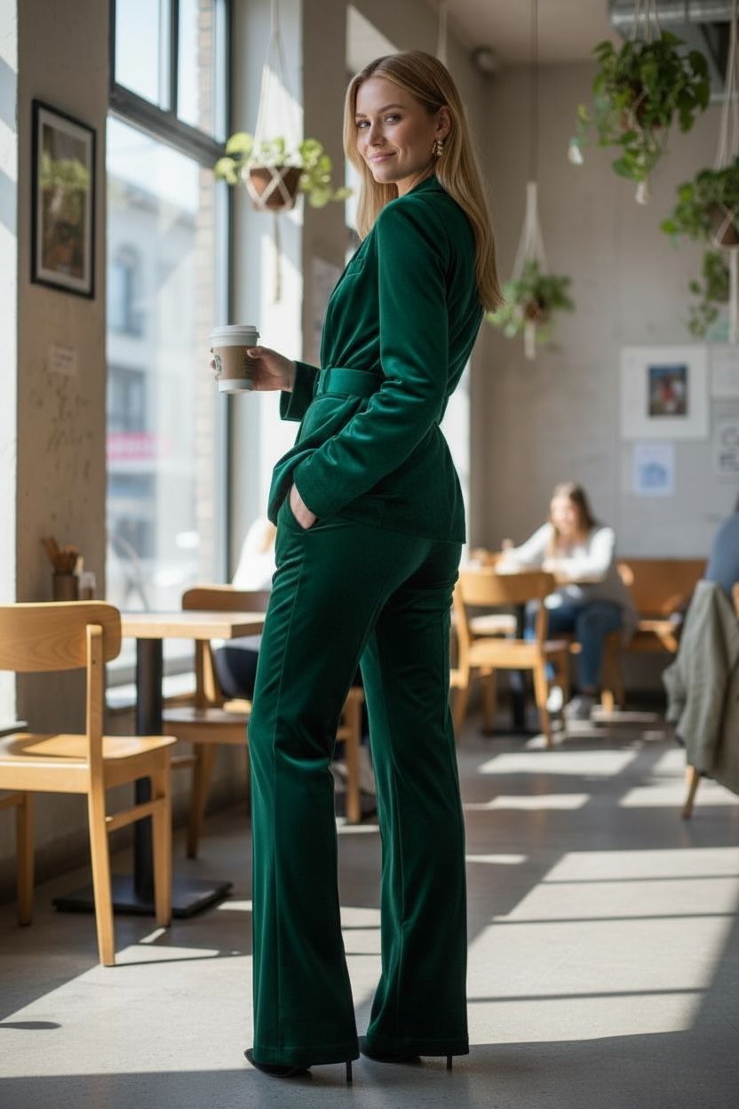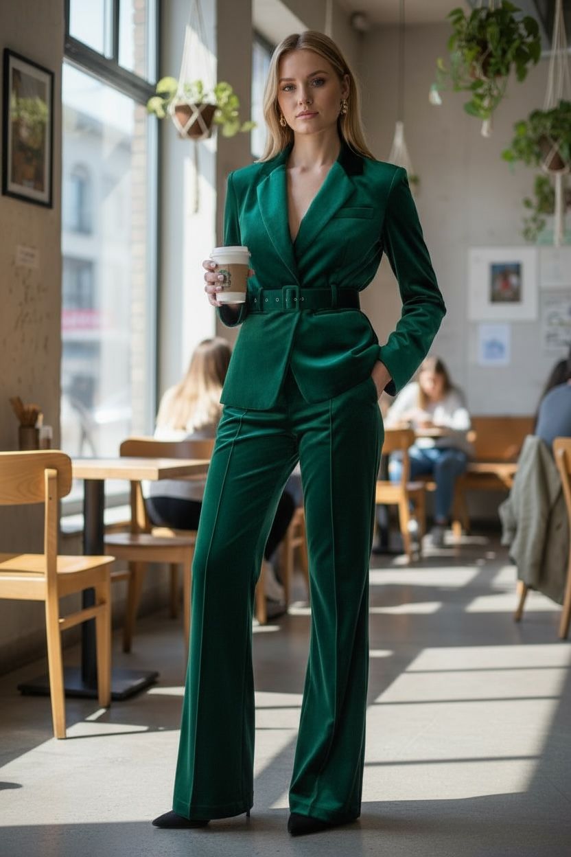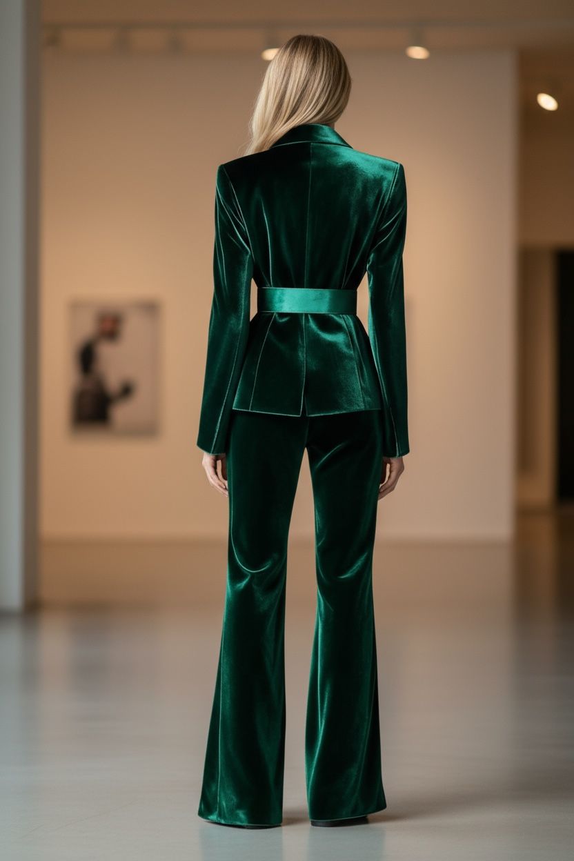This emerald velvet power suit combines refined craftsmanship with contemporary design. The belted blazer features a precision-cut silhouette that accentuates...