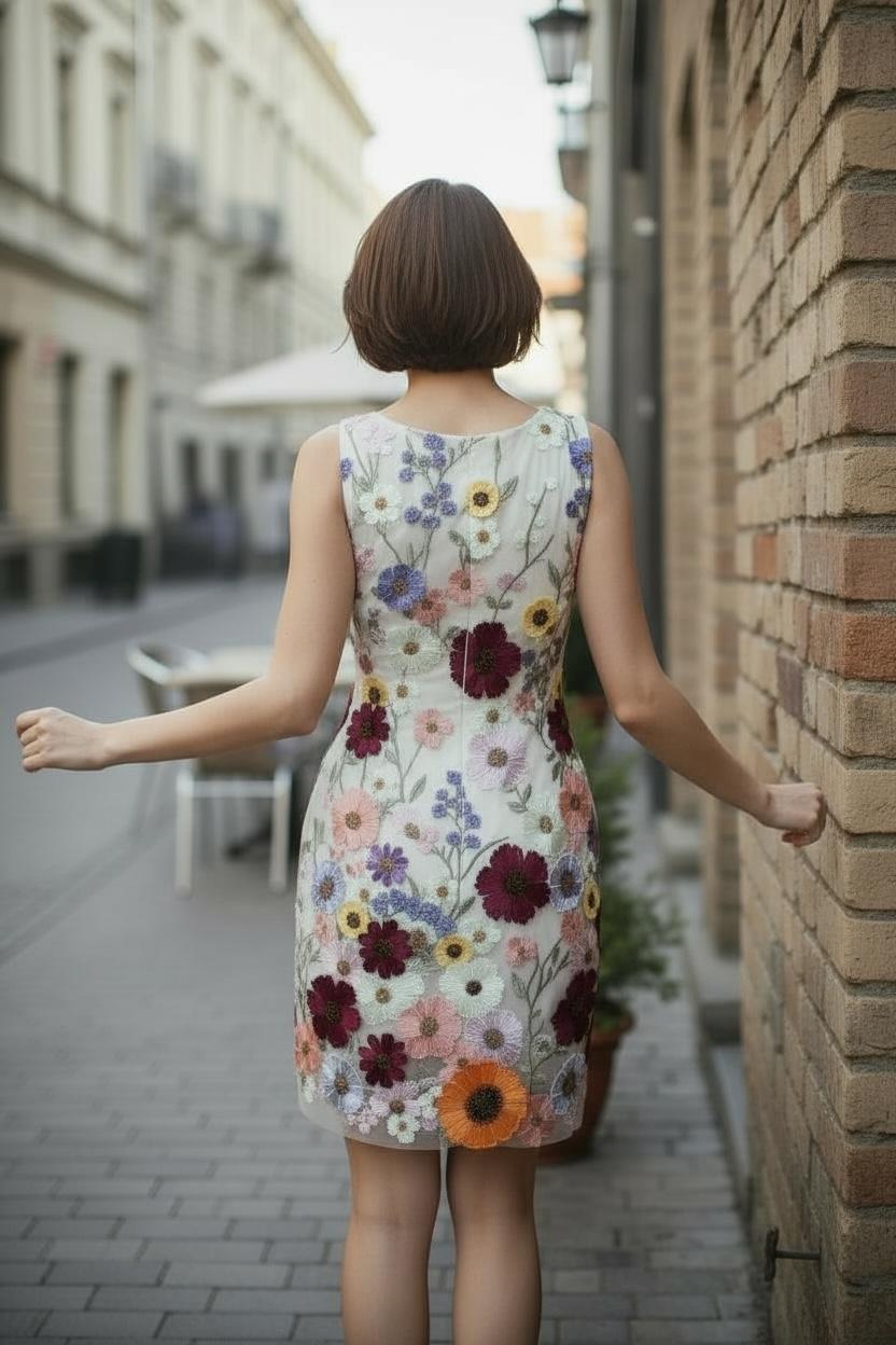 This floral fitted mini dress exemplifies contemporary elegance through its precision construction and botanical aesthetic. The tailored bodice creates a...
