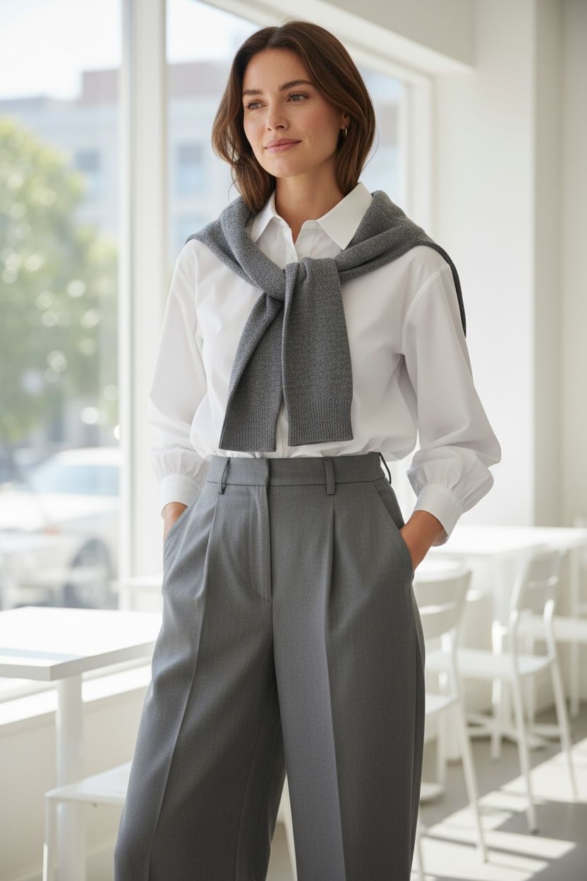 Elevate your wardrobe with this sophisticated gray and white pants suit from Luxe Muet. The expertly tailored ensemble features a...