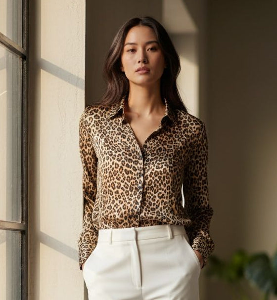 This leopard print satin long sleeve combines timeless animal print aesthetics with contemporary luxury. Crafted from premium satin, the fabric...