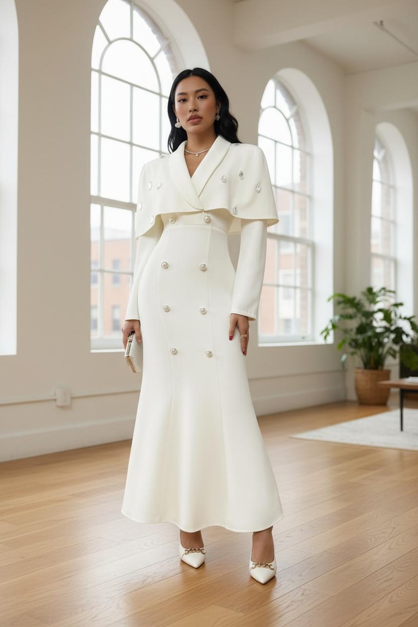 Long Elegant Cape Dress with Pearl Button and hand studded diamonds