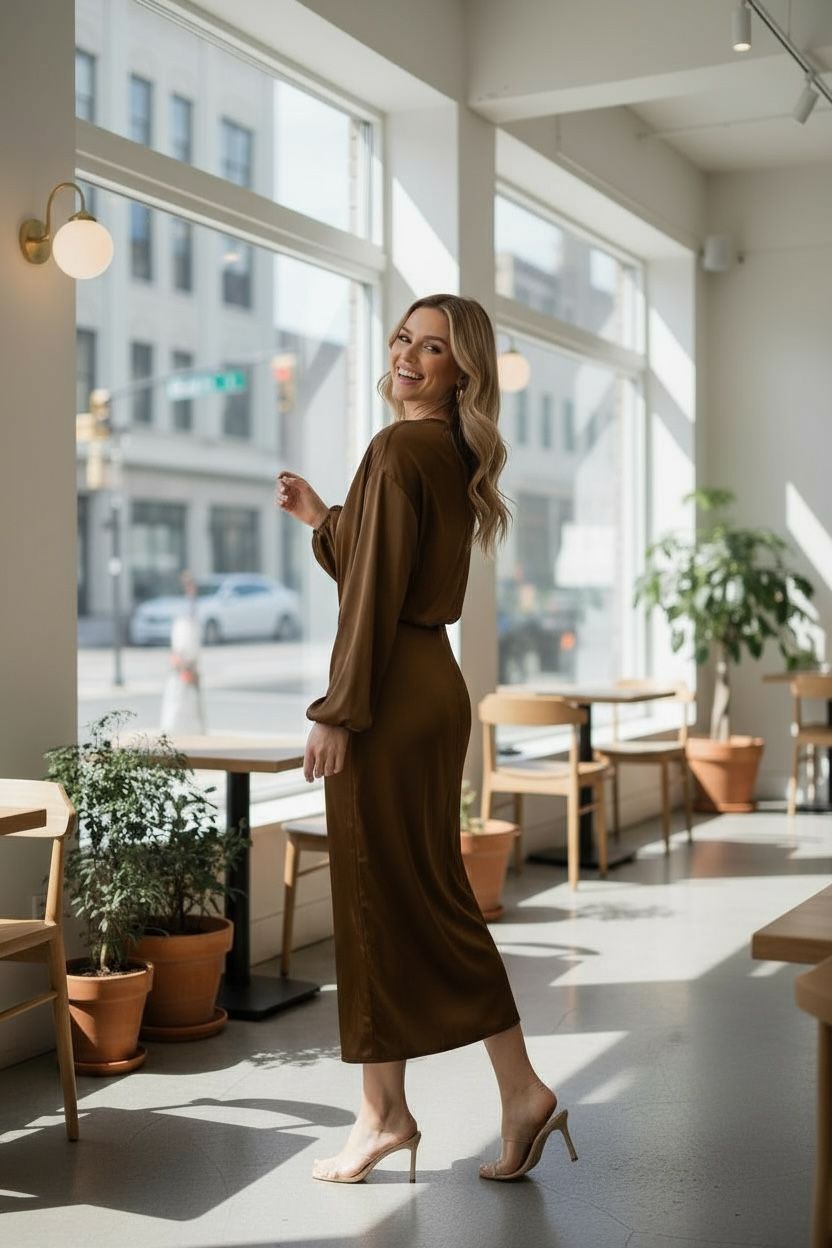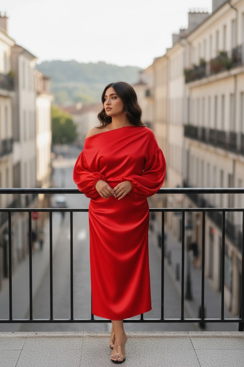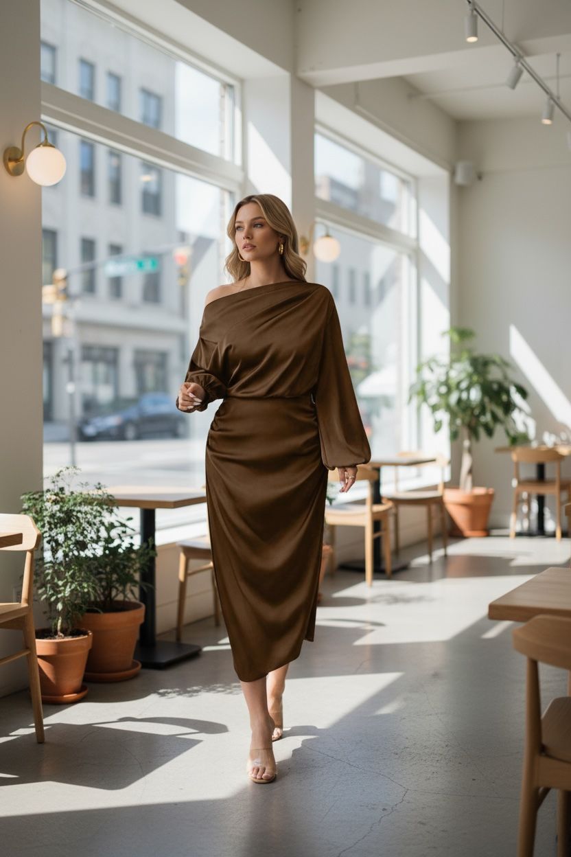 Satin Elegant Dress one-shoulder long sleeve midi gown.