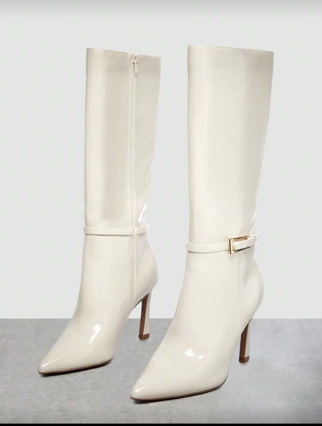 Glossy black knee-high boots that define Parisian confidence timeless, bold, and irresistibly sleek.