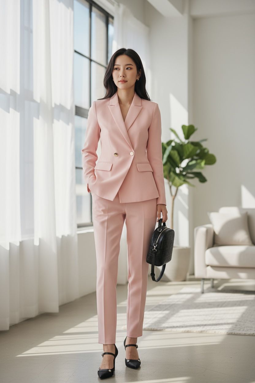 This refined pink jacket suit embodies understated luxury with impeccable construction and tailored proportions. The blush-toned fabric creates a sophisticated...